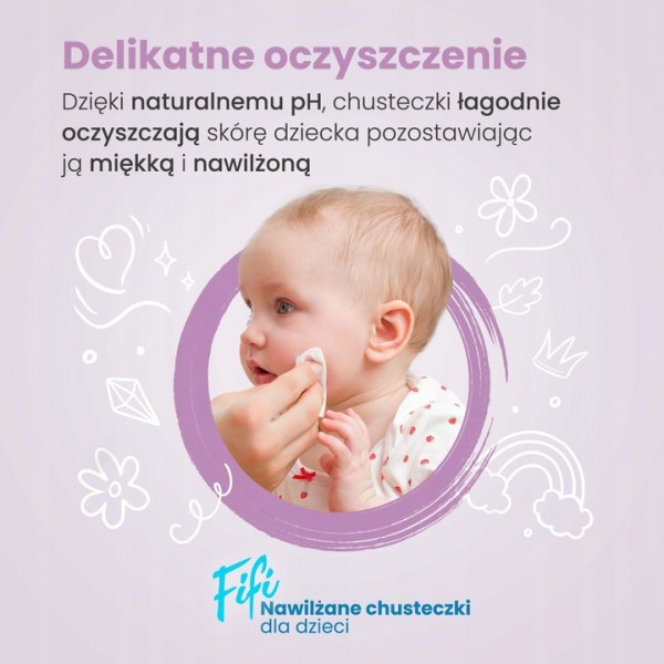 Chusteczki FiFi Wipes, to idealny sposób pielęgnacji delikatnej i wrażliwej skóry Twojego malucha. W trosce o najmłodszych stworzyliśmy produkt, który jest przeznaczony do stosowania już od pierwszego miesiąca życia dziecka.